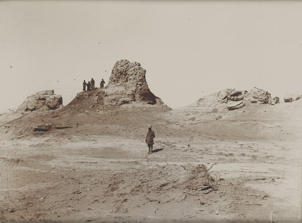 Genre: Architectural Photography Captioned in Stein's negative notebooks as 'Potai XXVI with labourers digging, from S.E.' PUBLISHED: 'Serindia', II, fig. 150, 'Ruined watch-tower T.XXVI, Tun-huang Limes, with refuse heap, seen from S.W.' Subjects = archaeological excavations; archaeological...