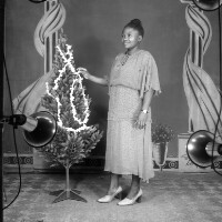 102. EAP054/1/158/374 Reference (shelfmark): EAP054/1/158/374 Title: Recreational photograph [c 1980] Scope & Content: Woman standing touching a plastic tree. Format of original: 59mm x 59mm plastic negative Collection Area: Endangered Archives Programme Languages: Not applicable Date Range: c 1980 Extent: 1 TIFF image