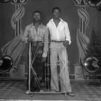 81. EAP054/1/158/245 Reference (shelfmark): EAP054/1/158/245 Title: Recreational photograph [c 1980] Scope & Content: 2 men standing behind iron grillwork Format of original: 59mm x 59mm plastic negative Collection Area: Endangered Archives Programme Languages: Not applicable Date Range: c 1980 Extent: 1 TIFF image