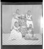 1. EAP449/2/14/85 Reference (shelfmark): EAP449/2/14/85 Title: A photo of five women: two wearing dresses sitting face-forward in front of a woman wearing a dress, head wrap, and necklace sitting face-forward in between two others wearing dresses, one wearing necklaces, standing face-forward in the studio. Collection Area: Endangered Archives Programme Languages: Not applicable Date Range: 2nd half od the 20th century Extent: 1 TIFF image