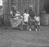 115. EAP054/1/152/115 Reference (shelfmark): EAP054/1/152/115 Title: Recreational photograph [c 1976] Scope & Content: 2 women sitting one with baby, and 2 children; raffia fence behind Format of original: 57mm x 59mm plastic negative Collection Area: Endangered Archives Programme Languages: Not applicable Date Range: c 1976 Extent: 1 TIFF image