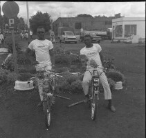 286. EAP054/1/152/286 Reference (shelfmark): EAP054/1/152/286 Title: Recreational photograph [c 1976] Scope & Content: 2 men posing on bicycles Format of original: 55mm x 59mm plastic negative Collection Area: Endangered Archives Programme Languages: Not applicable Date Range: c 1976 Extent: 1 TIFF image