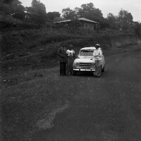 28. EAP054/1/152/28 Reference (shelfmark): EAP054/1/152/28 Title: Recreational photograph [c 1976] Scope & Content: 3 people standing by white Renault 4 car. Jacques? Format of original: 59mm x 59mm plastic negative Collection Area: Endangered Archives Programme Languages: Not applicable Date Range: c 1976 Extent: 1 TIFF image