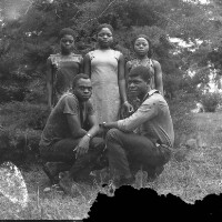312. EAP054/1/152/312 Reference (shelfmark): EAP054/1/152/312 Title: Recreational photograph [c 1976] Scope & Content: 3 young women standing behind 2 young men crouching. Damaged Format of original: 59mm x 59mm plastic negative Collection Area: Endangered Archives Programme Languages: Not applicable Date Range: c 1976 Extent: 1 TIFF image