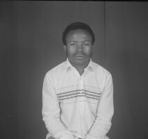 154. EAP054/1/169/154 Reference (shelfmark): EAP054/1/169/154 Title: Recreational photograph [c 1985] Scope & Content: Young man from Mbouda, standing one hand raised, finger pointing, feet as if walking Format of original: 59mm x 59mm plastic negative Collection Area: Endangered Archives Programme Languages: Not applicable Date Range: c 1985 Extent: 1 TIFF image