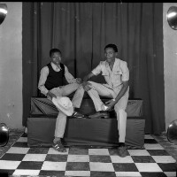 92. EAP054/1/47/92 Reference (shelfmark): EAP054/1/47/92 Title: Recreational photograph [c 1985 - 1986] Scope & Content: 2 young men sitting on a stepped bench, both have one foot on the bench, one has a hat on his knee. Format of original: 59mm x 59mm plastic negative Collection Area: Endangered Archives Programme Languages: Not applicable Date Range: 1985-1986 Extent: 1 TIFF image
