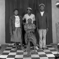 154. EAP054/1/47/154 Reference (shelfmark): EAP054/1/47/154 Title: Recreational photograph [c 1985 - 1986] Scope & Content: Woman sitting on a stool, legs crossed, hands on her thighs, 3 people standing behind her. Format of original: 59mm x 59mm plastic negative Collection Area: Endangered Archives Programme Languages: Not applicable Date Range: 1985-1986 Extent: 1 TIFF image