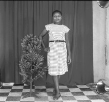 173. EAP054/1/47/173 Reference (shelfmark): EAP054/1/47/173 Title: Recreational photograph [c 1985 - 1986] Scope & Content: Girl from Mbouda, right hand on hip, next to a plastic tree. Format of original: 55mm x 59mm plastic negative Collection Area: Endangered Archives Programme Languages: Not applicable Date Range: 1985-1986 Extent: 1 TIFF image