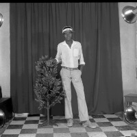 174. EAP054/1/47/174 Reference (shelfmark): EAP054/1/47/174 Title: Recreational photograph [c 1985 - 1986] Scope & Content: Young man from Mbouda, left hand in pocket, right hand on a plastic tree. Format of original: 59mm x 59mm plastic negative Collection Area: Endangered Archives Programme Languages: Not applicable Date Range: 1985-1986 Extent: 1 TIFF image