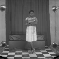 47. EAP054/1/47/47 Reference (shelfmark): EAP054/1/47/47 Title: Recreational photograph [c 1985 - 1986] Scope & Content: Girl from Mbouda, hand on hip, an iron grillwork in front. Format of original: 59mm x 59mm plastic negative Collection Area: Endangered Archives Programme Languages: Not applicable Date Range: 1985-1986 Extent: 1 TIFF image