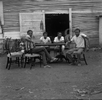 575. EAP054/1/47/575 Reference (shelfmark): EAP054/1/47/575 Title: Recreational photograph [c 1985 - 1986] Scope & Content: Dining table and chairs, with four people sitting on chairs, outside carpenters workshop. Format of original: 58mm x 59mm plastic negative Collection Area: Endangered Archives Programme Languages: Not applicable Date Range: 1985-1986 Extent: 1 TIFF image