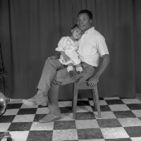 578. EAP054/1/47/578 Reference (shelfmark): EAP054/1/47/578 Title: Recreational photograph [c 1985 - 1986] Scope & Content: Man sitting on a stool, legs crossed, holding a baby, left hand on stool. Format of original: 59mm x 59mm plastic negative Collection Area: Endangered Archives Programme Languages: Not applicable Date Range: 1985-1986 Extent: 1 TIFF image