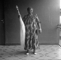 579. EAP054/1/47/579 Reference (shelfmark): EAP054/1/47/579 Title: Recreational photograph [c 1985 - 1986] Scope & Content: Woman standing holding a white horse tail fly whisk in right hand. Format of original: 59mm x 59mm plastic negative Collection Area: Endangered Archives Programme Languages: Not applicable Date Range: 1985-1986 Extent: 1 TIFF image