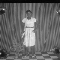 607. EAP054/1/47/607 Reference (shelfmark): EAP054/1/47/607 Title: Recreational photograph [c 1985 - 1986] Scope & Content: Women from Mbouda standing, hand on hip, bag over right shoulder. Dressed in white, bunch of flowers on floor. Format of original: 59mm x 59mm plastic negative Collection Area: Endangered Archives Programme Languages: Not applicable Date Range: 1985-1986 Extent: 1 TIFF image