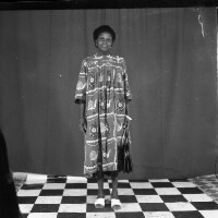 677. EAP054/1/47/677 Reference (shelfmark): EAP054/1/47/677 Title: Recreational photograph [c 1985 - 1986] Scope & Content: Woman from Babete in "pagne" outfit, standing, necklace, white bag over shoulder. Format of original: 59mm x 59mm plastic negative Collection Area: Endangered Archives Programme Languages: Not applicable Date Range: 1985-1986 Extent: 1 TIFF image