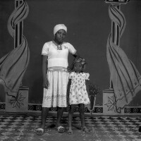 695. EAP054/1/47/695 Reference (shelfmark): EAP054/1/47/695 Title: Recreational photograph [c 1985 - 1986] Scope & Content: Woman standing with her child, both in white with scarves on heads. Format of original: 59mm x 59mm plastic negative Collection Area: Endangered Archives Programme Languages: Not applicable Date Range: 1985-1986 Extent: 1 TIFF image