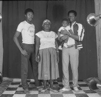 724. EAP054/1/47/724 Reference (shelfmark): EAP054/1/47/724 Title: Recreational photograph [c 1985 - 1986] Scope & Content: Family of four people, woman flanked by 2 men, one holding a baby. Format of original: 57mm x 59mm plastic negative Collection Area: Endangered Archives Programme Languages: Not applicable Date Range: 1985-1986 Extent: 1 TIFF image