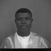 Man sitting on a chair in a hat and a white "gandoura" gown, right foot crossed over his left, holding a piece of paper. Format of original: 59mm x 59mm plastic negative