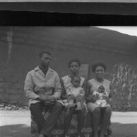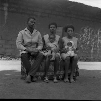Five people: man sitting on left of a bench, 2 women sitting on the same bench with 2 babies on their knees. Format of original: 59mm x 59mm plastic negative
