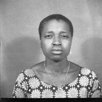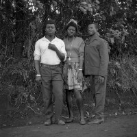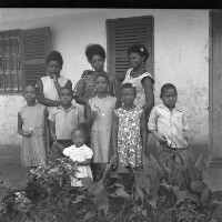 9 people: 3 young women at back, 2 little boys and 4 girls standing, in front of a house with a small garden, plants in front. Format of original: 59mm x 59mm plastic negative