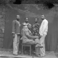 91. EAP054/1/80/91 Reference (shelfmark): EAP054/1/80/91 Title: Recreational photograph [c 1970-c 1995] Scope & Content: Five people: a man sitting on a stool, legs crossed, in front of two men and two women standing. Format of original: 59mm x 59mm plastic negative Collection Area: Endangered Archives Programme Languages: Not applicable Date Range: c 1970-c 1995 Extent: 1 TIFF image