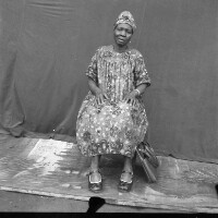 123. EAP054/1/80/123 Reference (shelfmark): EAP054/1/80/123 Title: Recreational photograph [c 1970-c 1995] Scope & Content: Old woman sitting on a stool, hands on thighs, handbag by left foot. Format of original: 59mm x 59mm plastic negative Collection Area: Endangered Archives Programme Languages: Not applicable Date Range: 01 Jun 2007 Extent: 1 TIFF image