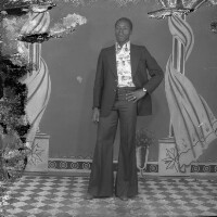 202. EAP054/1/80/202 Reference (shelfmark): EAP054/1/80/202 Title: Recreational photograph [c 1970-c 1995] Scope & Content: Man in suit and patterned shirt standing, left hand on hip. Format of original: 59mm x 59mm plastic negative Collection Area: Endangered Archives Programme Languages: Not applicable Date Range: 05 Jun 2007 Extent: 1 TIFF image