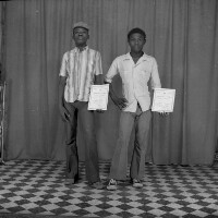 136. EAP054/1/85/136 Reference (shelfmark): EAP054/1/85/136 Title: Recreational photograph [c 1961] Scope & Content: 2 young men each holding a certificate Format of original: 59mm x 59mm plastic negative Collection Area: Endangered Archives Programme Languages: Not applicable Date Range: 21 Jul 2006 Extent: 1 TIFF image