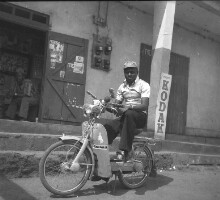 265. EAP054/1/85/266 Reference (shelfmark): EAP054/1/85/266 Title: Recreational photograph [c 1961] Scope & Content: Man on a motorbike in front of a shop, man sitting inside. Format of original: 54mm x 59mm plastic negative Collection Area: Endangered Archives Programme Languages: Not applicable Date Range: 28 Jul 2006 Extent: 1 TIFF image
