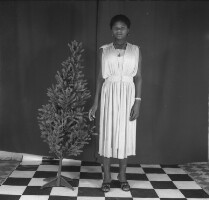 116. EAP054/1/97/116 Reference (shelfmark): EAP054/1/97/116 Title: Recreational photograph [c 1984] Scope & Content: Woman from Bamessingue standing by plastic tree Format of original: 57mm x 59mm plastic negative Collection Area: Endangered Archives Programme Languages: Not applicable Date Range: c 1984 Extent: 1 TIFF image