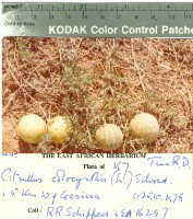 280. EAP923/1/1/1/280 Reference (shelfmark): EAP923/1/1/1/280 Title: Citrullus colocynthis; in West of Garissa Scope & Content: Genus: Citrullus, Taxonomic classification: Cucurbitaceae. Author(s)/Creator(s): R.R.Schifllers. Scribe(s): Jane Chilande. Collection Area: Endangered Archives Programme Languages: Not applicable Date Range: 25 Oct 1978 Extent: 1 tiff image, 23.8 MB