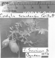 324. EAP923/1/1/1/324 Reference (shelfmark): EAP923/1/1/1/324 Title: Cordyla somalensis ; in Ogaden. Scope & Content: Genus: Cordyla, Taxonomic classification: Fabaceae. Author(s)/Creator(s): J.B.Gillett. Scribe(s): Jane Chilande. Collection Area: Endangered Archives Programme Languages: Not applicable Date Range: 1954 Extent: 1 tiff image, 2.7 MB