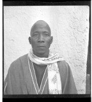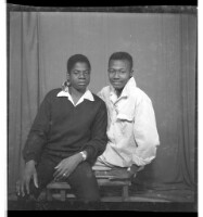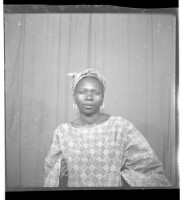 - A woman wearing a dress and headscarf sitting facing forward in the studio.
