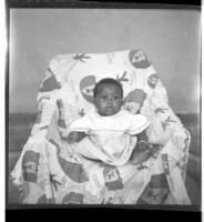 - A baby girl wearing a dress sitting facing forward in a chair in the studio.