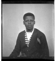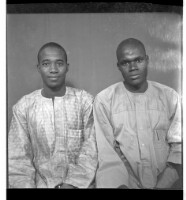 - Two boys wearing dress shirts sitting facing forward in the studio.
