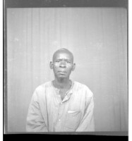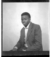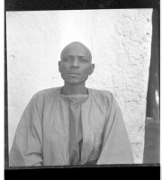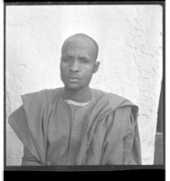 A man wearing a boubou and scarf around his neck sitting facing forward in the studio.