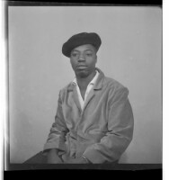 A man wearing a dress shirt and a beret sitting facing forward in the studio.