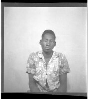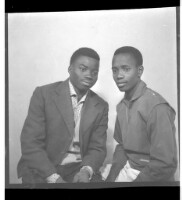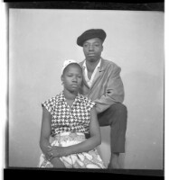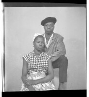 A girl wearing a dress shirt and skirt and headscarf sitting in profile in front of a man wearing a dress shirt, pants and beret, standing facing forward in the studio.