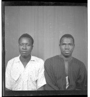 Two men, one wearing a dress shirt and the other a boubou, both sitting facing forward in the studio.