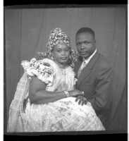 - A man wearing a jacket and tie with a woman wearing a dress and headscarf, both sitting in profile in the studio.
