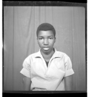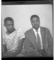 - A man wearing a velvet jacket and dress shirt sitting next to a boy wearing a dress shirt sitting facing forward in the studio.