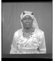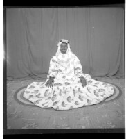 - A woman wearing a large dress and headscarf sitting in profile in the studio.