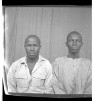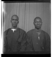 - Two men wearing boubous sitting facing forward in the studio.