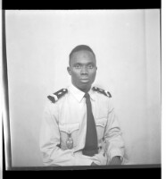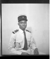 - A man wearing am Arabic boubou and Arabic headscarf sitting facing forward in the studio.