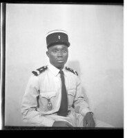 - A man wearing a military uniform and hat sitting in profile in the studio.