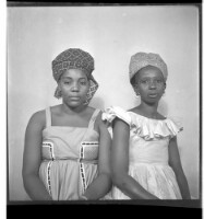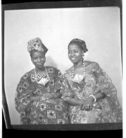 - Two women wearing dresses and headscarves sitting facing forward in the studio.