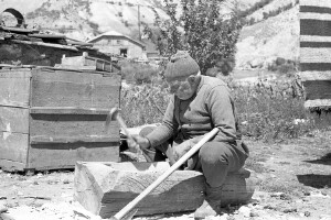 An elderly man digging a channel; Place Zabral outside the town of Devin; 1948-1952; taken by N. Nikolov; Black-and-white negative with good quality, dirty; 24x36 mm; Inventory in Bulgarian language