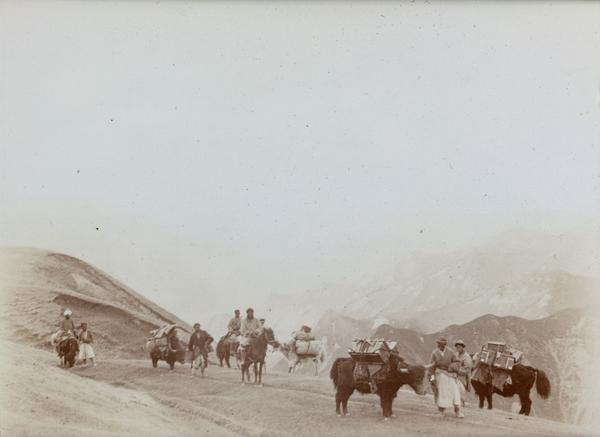 - Genre: Landscape Photography View looking across mountainous landscape, with yaks and ponies in foreground. PUBLISHED: 'Ruins of Desert Cathay', vol. 1, pl. 36: 'Our train of yaks and ponies crossing the Kashka-su Dawan. View to south.' Subjects = archaeological expeditions; archaeology; exp...