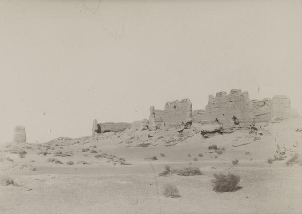 Genre: Architectural Photography PUBLISHED: 'Ruins of Desert Cathay', vol. 2, pl. 162: 'Ruined watch-tower T. XXV., north of Tun-Huang Oasis, seen from south-west.' 'Serindia', II, fig. 152, 'Ruined watch-tower T.XXV, north of Tunhuang, seen from south-west.' Subjects = archaeological expedit...