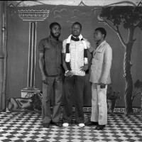 Young man from Bamessingue, in white short-sleeved shirt, left hand on hip, in front of the photographers studio in Mbouda, BPC bakery behind. Format of original: 59mm x 59mm plastic negative